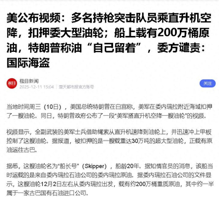 这不是电影画面,是美国当着委内瑞拉的面,在其海岸附近强行扣船的现场,更嚣张的是特朗普,被问油怎么处理时直接说“我想我们会留着它”,这场海上抢劫到底藏着什么猫腻,国际社会又该怎么看。